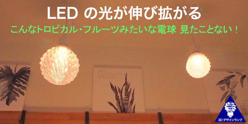 3 つの波模様が交差する,トロピカルフルーツのような形の電球カバー (シェード) によって光が拡がり輝く 3Dデザイン電球 Xing303 (クロッシング 303) を通販しています.独自の 3D 印刷でつくった電球カバーによって,従来の電球になかったやりかたで LED の光が伸び,広がり,きらめきます.トロピカルフルーツ風 3D デザイン電球についてはブログ記事でより詳細に紹介しています.