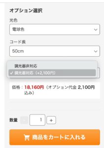 電球やペンダントライトを調光器対応にするには,Yahoo! ショッピングの場合は左下のようなオプション選択で「調光器対応」を選択します.また,楽天の場合は右下のように商品ページにある「調光器対応」オプションをあわせて購入する必要があります.いずれも電球 1 個あたり 700 円です.ただし,電球の種類によっては調光器対応にできないものもあります.