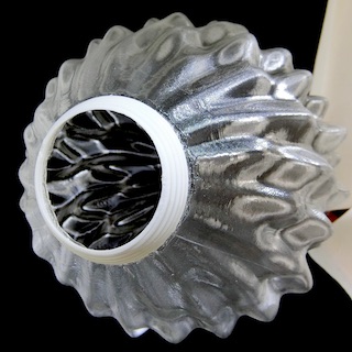 最初の写真はネジをはめこんだところ,2 番めはシェード側,3 番めは本体側の写真です. 極端にふとさを変化させるとネジどめができなくなってしまうので,かなりぎりぎりのかたちにはなっています. このようなかたちのテーパ・ネジをかんがえているひとつの理由は,これによって電球の 3D 印刷部分全体を「波合成モデル」というひとつの単純なモデルだけで構成できることです. このネジによって,電球本体を数回まわすことで,無理なちからをかけずにシェードをしっかり固定することができます. ただし,ここをネジにしたことで電球をソケットからはずす際にカバーがはずれてしまう危険がでてきます.そのため,このネジにはシリコンゴム (セメダイン XG2) をぬって,はずれにくくしています.