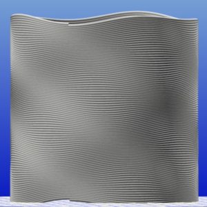 螺旋 3D 印刷では「波合成モデル」によって,つまり正弦波 (サイン・ウェーブ) をくみあわせて形や模様をつくっていますが,あるとき,つぎのような 3 つの波をくみあわせることによって複雑なモアレ模様ができることを発見しました.その 3 つの波とは,下の最初の図のようなフィラメントを上下させる波 (ヴィブラートと呼んでいますが,この図では 2 つの横波がかさなっています) と,下の 2 番めの図のような半径方向に変形させる波 (ひとつの縦波) です.