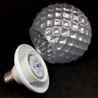 3D デザイン電球は基本的に 3 つの部品をくみあわせてつくっています.第 1 は LED と電極がついた LED 本体,第 2 は透明なカバー (ランプシェード) ですが,そのあいだに第 3 の部品である白い「アダプタ」があります.LED 本体とカバーを直接つなぐとカバーが高温になるなどの問題がおこりうるので,このアダプタをあいだにはさんでいます.このアダプタは LED 本体と接着されていますが,通常はカバーには接着されていません.ここはネジ (テーパネジ,テーパーネジ) でくみあわせるようになっています.