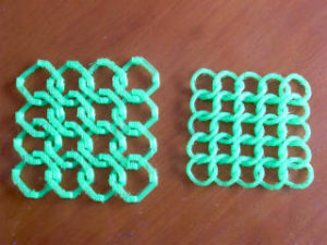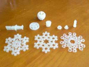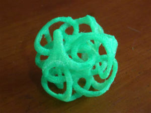 こちらも当時のはやりのレーザカットした板をつかっていましたが,板だけの Printrbot とはちがって化粧板をつかっていました.デルタ形のプリンタを買ったのは Z 軸方向にも高速に移動できるからでした.ヘッドを自由な方向にうごかして,普通はできないもの,つくりにくいものをつくりたかったのです.