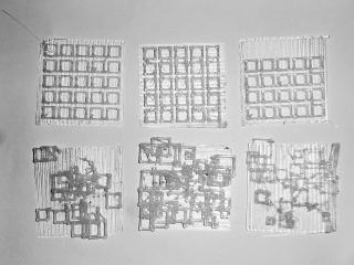 そういう,ひとがやらないことのひとつが「3D ゆらぎ印刷」(当時つかったことばでは「セル・オートマトン風のパターン」の印刷) です.それについて最初に書いたのが「3D プリンタがつくりだす,セル・オートマトン風のパターン」や「3D プリンタによる準 2 次元セル・オートマトン風パターン」という個人ブログ記事 (2013 年) です (下の写真).これらは Rostock MAX で印刷したものですが,このころはまだ Printrbot もつかっていたので,「Pritrbot によるセル・オートマトン風パターン」では同様のことを Printrbot でもためしました.