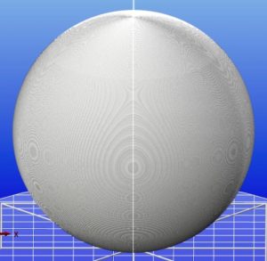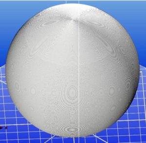 きれいなはずの螺旋 3D 印刷のモデル,たとえば球をグラフィクスで表示してもモアレ縞ができます (下の図は Repetier Host で表示したもの).これは,フィラメントがつくる線とピクセルがつくる線との干渉でできたものです.角度を変えると模様が変化するので,ビデオでみるとおもしろいとおもいます.