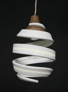光源は螺旋形ではありませんが,渦巻型 (スクリュー形) の 3D デザイン電球はシェードに螺旋形の模様をつけています.波合成モデルでのデザインの際に縦波だけにして同心円にすることもできましたが,すこし横波もいれて螺旋にしています.