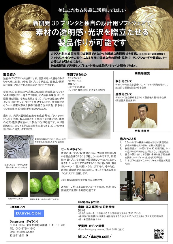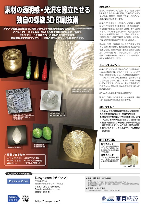 2018 年の秋のことですが,東京ビッグサイトでひらかれた「産業交流展」のなかに東京都の中小企業振興公社がもうけたブースのなかに螺旋 3D 印刷でつくったさまざまな試作品や商品を展示してきました.都の「東京ビジネスフロンティア」というプロジェクトで採用されたからです.つぎの画像 (とリンクされた PDF) がそのときつくってもらった 2 枚のビラです.先方でことばと写真をえらんでつくってくれたものなので,私の感覚とはちがうところもありますが,逆にこちらでは気づかなかった視点もはいっています.