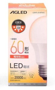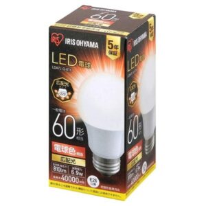 たとえば白熱灯 60 W 相当の電球色の電球でいえば LDA7L-G-6T6 と LDA7L-G-6T6-E というのがあります.後者は AGLED という名前で販売されています.前者は 4 万時間と 5 年,後者は 2 万時間と 1 年です.どちらも楽天などで安いものをさがすと 1 個 300 円くらいで買うことができます.消費電力もちがっていて,前者は 6.9 W,後者は 7.4 W です.この型の電球にはほかに昼白色と昼光色のものもあります (ただし,型番の最後に E がついた昼光色の電球はないようです).