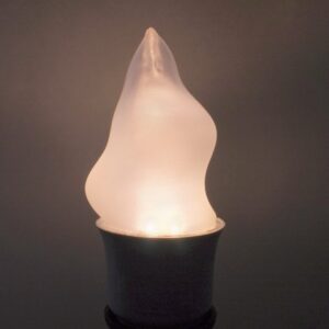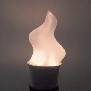 光沢があるカバーをつかうと,フィラメント電球よりさらに鋭い光がえられます.写真ではコントラストがかぎられてしまうので十分には表現できませんが,それでもこの明るさ感をある程度はわかっていただけるかとおもいます.光源は白熱電球 20 W 相当の LED 電球本体につけられた 3 個の 3 mm 角くらいの LED チップですが,その光が縦にのびています.