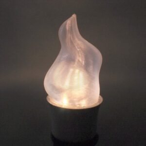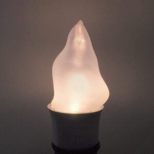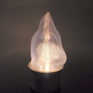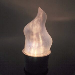 シェードの表面に光沢をつけるかマットにするかはまだ完全にコントロールできていないので,まだ製品でそれをうたってはいません.しかし,螺旋 3D 印刷の条件をすこし変えるだけで,どちらも透明プラスティック・フィラメントを 1 回巻くだけで,後処理なしで光沢をつけたりマットにしたりすることができます.たとえば炎形/鳥形のシャンデリア電球でためしてみると,つぎのようなちがいがでてきます.