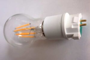 LED 電球をコンパクト蛍光管のソケット GX10q につなぐ方法は「コンパクト蛍光灯の DIY による LED への交換」における方法とおなじであり,GX10q に LED 電球をつなぐためのアダプタを改造して使用します.フィラメント電球をこのアダプタにつないだ写真をしめします.