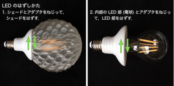 LED が交換できることで,つぎのような利点がうまれます.シェード内の光源 (LED) が切れたときに交換するだけでなく,いろいろな種類の光源をつければ様々なきらめく光が楽しめます.また,普通の LED 電球をいれれば光がやわらげられます.昼白色や昼光色の光源にいれかえられます.つけてみて明るすぎたり暗すぎたりしたときも光源だけ交換できます.さらに,付属している 40〜60 W 相当から明るさをぐっとおさえれば眩しくなくなって,きらめきをじっくり楽しむことができます.これらの利点についてはブログ記事でよりくわしく説明しています.