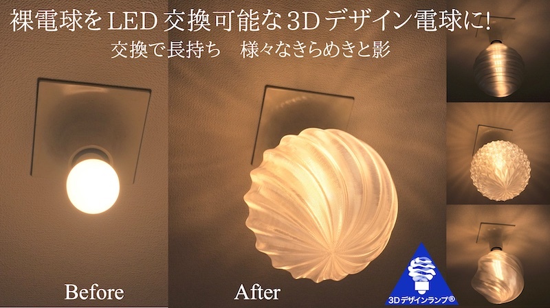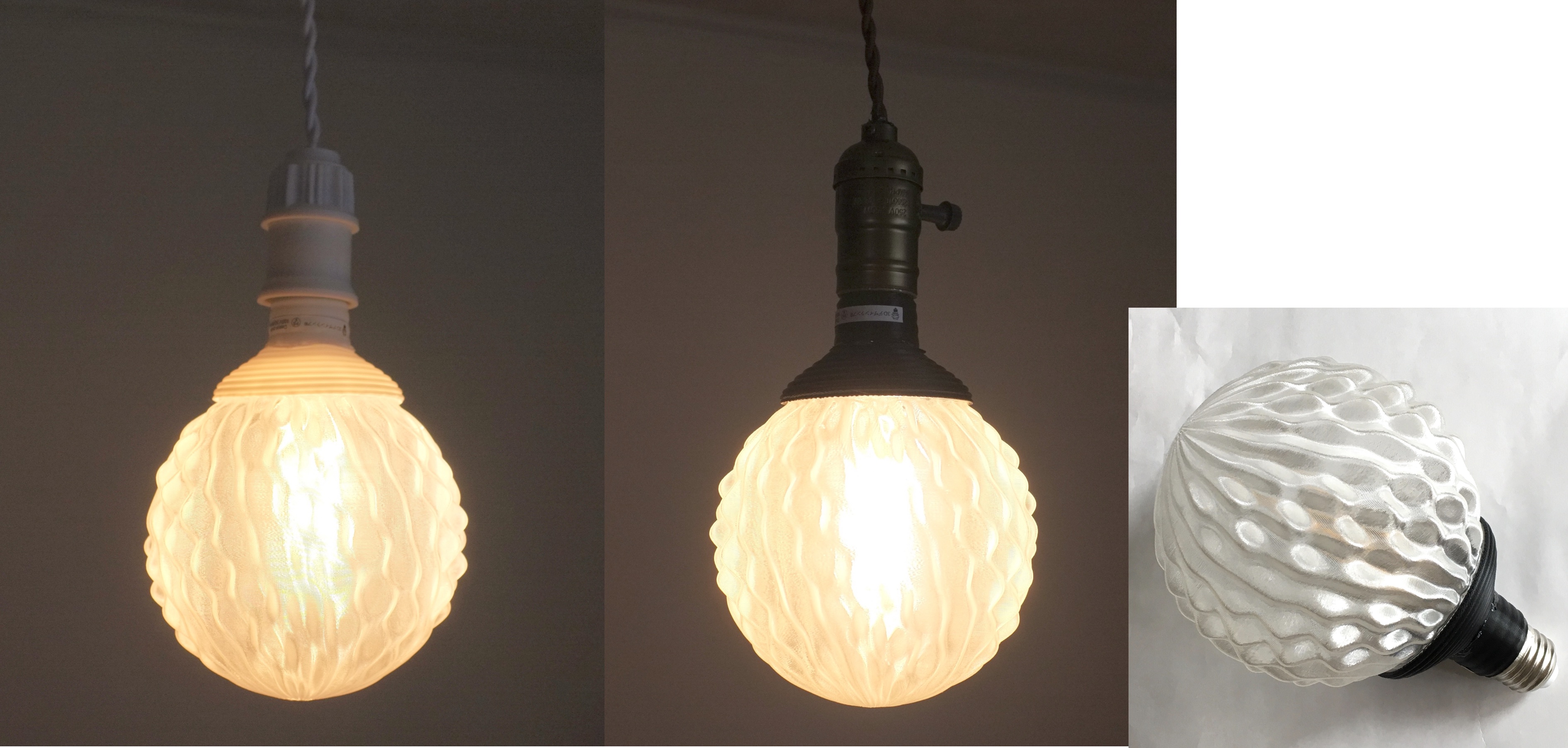 3Dデザイン電球は他社にまねのできない 3D 印刷シェードのきらめく光でご好評をいただいている裸電球です.この電球 IIng W はそれに加えて天井にできる影が魅力的なうえに,明るさや色があわないときや切れたときなどにも光源が交換できる高コスパの 3D デザイン電球です.従来の裸電球とちがってシェードごと捨てて交換する必要がなくなりました.