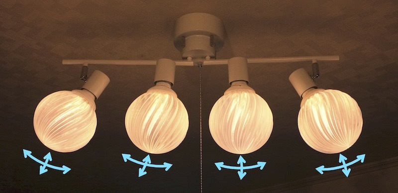 電球ソケットの向きが変えられるので,電球の角度を 1 個ずつ調整できます.電球が向いている方向により強い光があたるので,角度の調整によってより明るさが必要な部分に強い光をあてることができます.