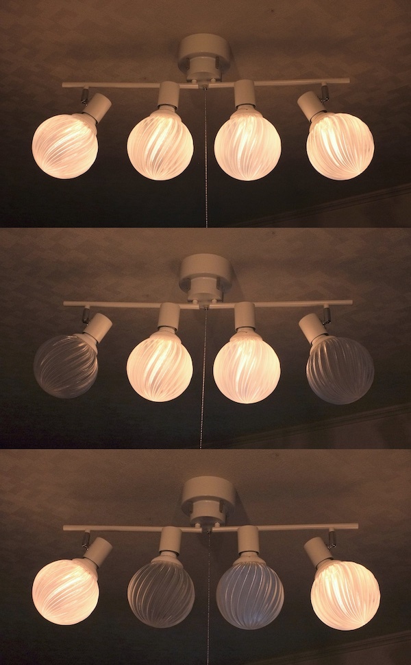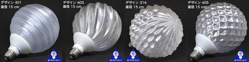 普通の電球は模様のないのっぺりした形をしていて,光を一様に拡げる変化のない光をだします.しかし,このシーリングライトで使用している 3Dデザイン電球には様々な形があり,こまかい模様があります.そのため,お好きなものを選択して形や模様・質感を楽しむことができるうえ,その光には強弱がつき,美しくきらめきます.サイズも直径 10 cm から 18 cm まであります.大きいサイズのほうがまぶしさがおさえられ,魅力的な光をだします.