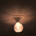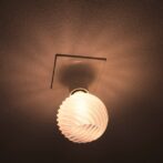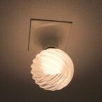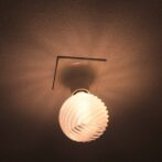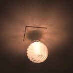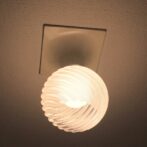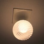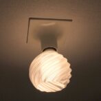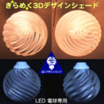 廊下やトイレなどの裸電球を透明な電球カバー「3Dデザインシェード」でかざってみませんか? この巻糸模様つきの電球カバーは,普通の LED 電球にかんたんに取り付けられて,まぶしさがおさえられ,ひとあじ違う輝きがえられます.電球を LED フィラメント電球 (エジソン電球) に変えれば,もっと きらきらと きらめきます.(下の写真をご覧ください.) また,天井に魅力的な影ができます.
