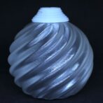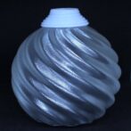 この電球カバーは PLA というプラスティックをつかった 3D 印刷で 1 回らせん状にまきつけてつくっています.通常の 3D 印刷とはちがう新開発技術 (特許出願中) です.同様の方法でつくっている地球儀の印刷のようすを YouTube でみることができます.