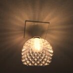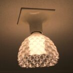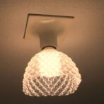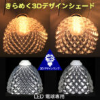 廊下やトイレなどの裸電球を透明な電球カバー「3Dデザインシェード」でかざってみませんか? この巻糸模様つきの電球カバーは,普通の LED 電球にかんたんに取り付けられて,まぶしさがおさえられ,ひとあじ違う輝きがえられます.電球を LED フィラメント電球 (エジソン電球) に変えれば,もっと きらきらと きらめきます.(下の写真をご覧ください.) また,天井に魅力的な影ができます.