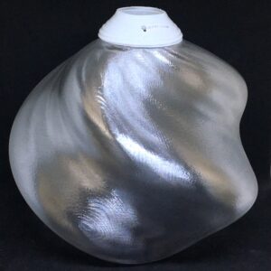 ランプシェードは透明なプラスティック (PLA=ポリ乳酸) をつかって 3Dプリンタでつくっています.生分解性プラスティック PLA 製なので,いろいろつけかえてためしても環境負荷はちいさくてすみます.キャップ (根本の部分) は熱に強いプラスティック (ABS) でつくっていて,その色はオプションによって白と黒から選択できます.また,口金 E26 の電球に適合するものと E17 に適合するものをオプションによって選択できます.オプションで E14, E12 にも対応します.つぎの写真は口金 E26 の白と黒のキャップです.(いずれの場合も電球カバー本体は透明です).