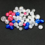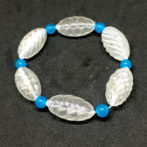 ブレスレットは試作したことがあります.左下の写真は螺旋 3D 印刷した球ではなく楕円体 (球をひきのばしたかたち) を材料とした手作りブレスレットです.楕円体のあいだに再生されたアクアマリンをはさんでいます.もちろん楕円体でなく右下の写真のような球をつかうこともできます.同様のやりかたでペンダントをつくることもできるとおもいます.ボリュームのあるネックレスをつくっても,とても軽量です.外光で光り輝くネックレスやブレスレットをつくることができます.また,内部に LED を仕込むこともできます.